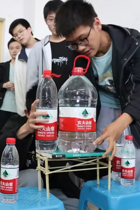 比赛开始前,工作人员布置比赛场地并清点道具。参赛选手到达比赛场地后有序签到,工作人员讲解比赛规则与注意事项。比赛过程中,同学们认真比赛,无作弊行为,工作人员监督并维持现场秩序,现场风气良好。比赛结束时,各组选手按照序号进行桥梁承重,裁判组根据比赛规则决出比赛名次并记录比赛成绩。比赛结束后,由工作人员收集比赛作品及其物资放于学院办公室处,并对比赛场地进行清洁。