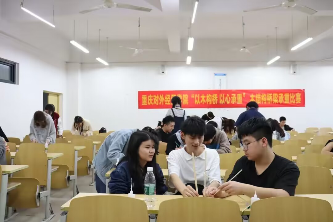 为了激发大学生的科技创新激情,增强大学生的动手实践能力,形成科技发明制作的良好风气,活跃校园文化生活。数学与计算机学院于2023年4月27日在合川A校区3302教室,铜梁校区T3402教室开展重庆对外经贸学院第三届科技活动月暨数学文化节“以木构桥,以心承重”木结构桥梁承重比赛。