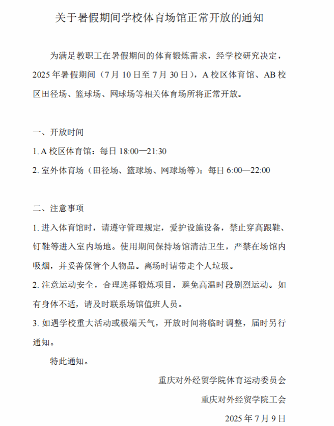关于暑假期间学校体育场馆正常开放的通知