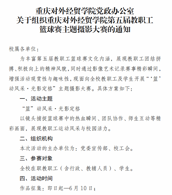 关于组织重庆对外经贸学院第五届教职工篮球赛主题摄影大赛的通知
