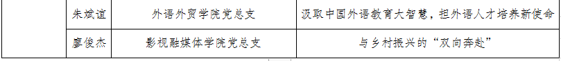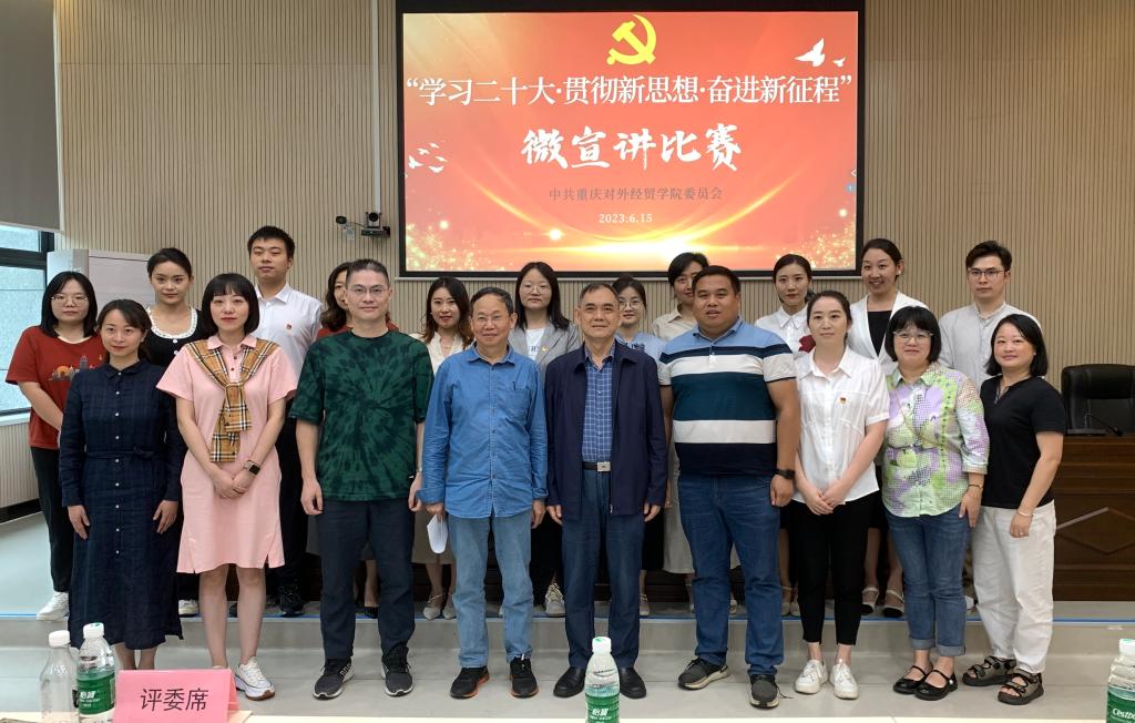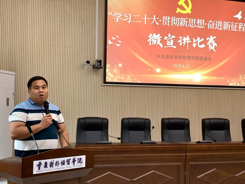 为进一步推动学习贯彻习近平新时代中国特色社会主义思想主题教育深入开展,深学笃行习近平总书记关于青年工作的重要思想,6月15日,由校党委组织部、马克思主义学院、外语外贸学院承办的“学习二十大·贯彻新思想·奋进新征程”微宣讲比赛在9106会议室开展。马克思主义学院刘康、王顺达、李亚军、王开敬、尹艳五位老师担任评委,经各二级学院党总支初赛评选,共有12名党支部书记进入决赛。各位参赛选手按照赛前抽签顺序,依次上台宣讲。