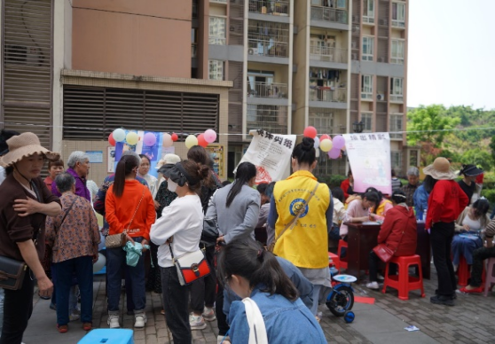 “最美记忆”:居民们在摊位上选择自己喜欢的配饰,摆出自己喜欢的姿势,志愿者用相机为社区居民留下最美的纪念。