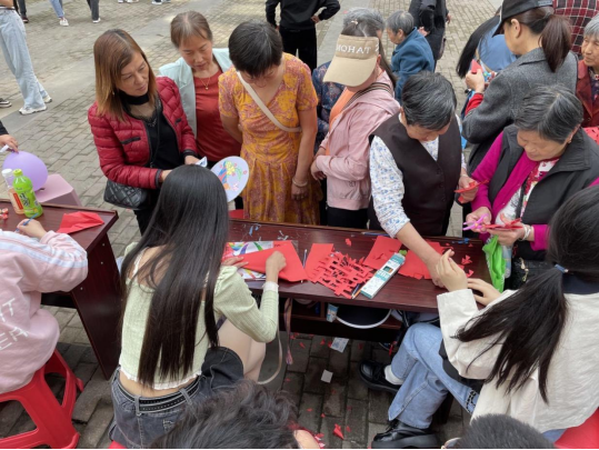 “快乐剪纸”:剪纸是一种民间艺术,志愿者和居民们用一张彩纸、一把剪刀,剪出各式各样的红色文化图案,充分表达了志愿者和居民们的浓浓爱国情。