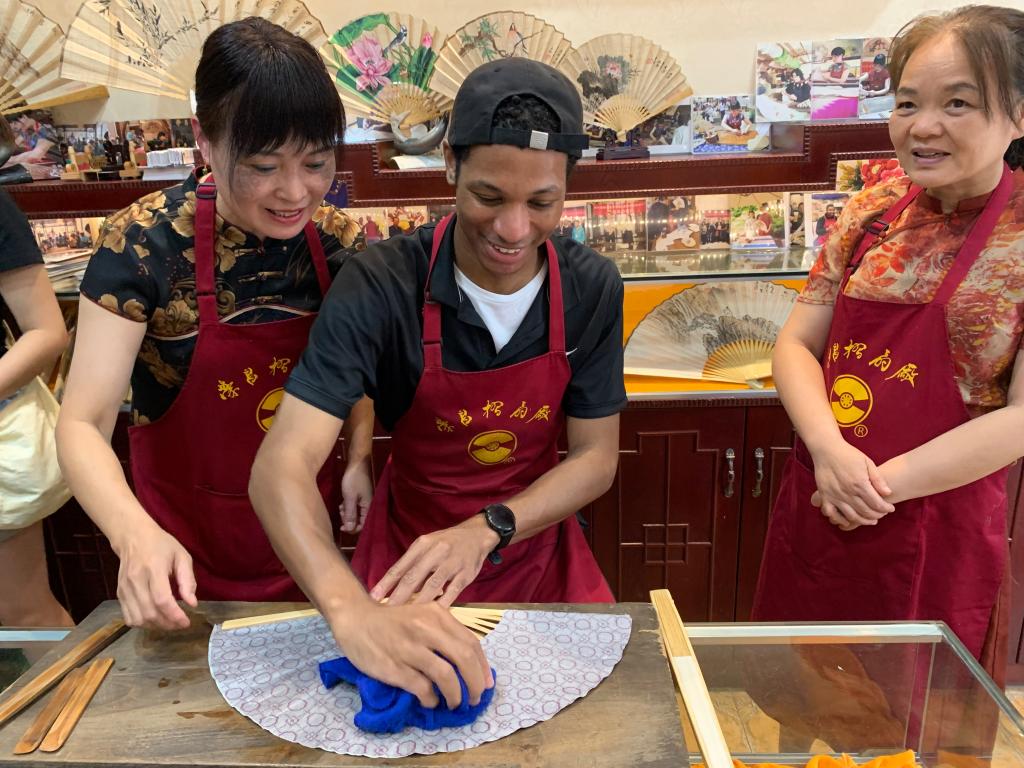 随后众人来到荣昌折扇厂,听取折扇厂负责人尹春莲女士介绍荣昌折扇及其家族四代传承折扇制作技艺的历史,来自美国的外教James和泰国的留学生陈楚云还专门体验学习了折扇的制作。