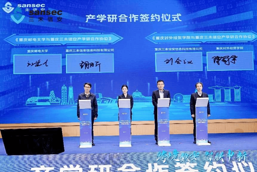 “中新云化数据安全服务平台”隆重揭牌,该平台旨在促进中新两国在数字领域的合作,通过提供全生命周期的数据安全防护服务,保障数据在跨境传输过程中的安全性和合规性。陈院长代表学校与重庆三未信安信息科技有限公司签订了产学研合作协议,共同推动学校及学院在中新互联互通项目上的发展。双方将围绕数字技术的基础研究、重大关键技术以及产业共性技术的创新性研究等多个领域,共同探索数字人才的培养和技术产业化的创新路径,促进相关科研成果的市场化转化,成功搭建起产业需求与教育供给的精准对接平台。