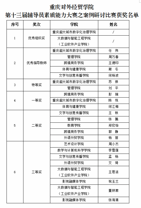 经过三个多小时的激烈角逐,选手们凭借扎实的专业知识和丰富的工作经验,深入剖析案例。最终,重庆超大城市数字化治理学院、大数据与智能工程学院(工业软件产业学院)荣获“优秀组织奖”,重庆超大城市数字化治理学院党总支书记任伟、管理学院党总支书记周万春、跨境商务学院党总支副书记王德印、体育与健康学院党总支书记谢冬、文学与创意传播学院党总支书记何杨波荣获“优秀指导教师”称号,参赛选手苏姝、刘平凭借卓越表现斩获特等奖,彭瑞、陈悦、何江梅获得“一等奖”,王轶、张腾、郑欣怡、郭静、杨丽获得“二等奖”,周小杰、李雪莲、孟杨、文琦、王思洁、祝玉兰、董妍君、张海清获得“三等奖”,他们用实力展现了自己的职业素养和工作能力。