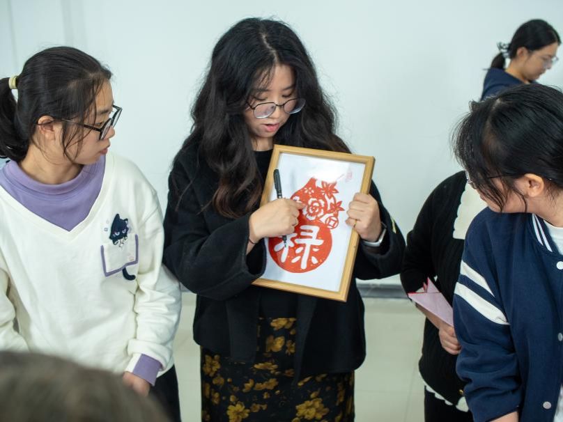 活动现场的剪纸环节,由青海省格尔木市第四代非遗剪纸传承人母雯欣同学负责讲解。她介绍剪纸历史、分类及派系特征后,结合自身经历讲解纸张折叠、图案勾画、工具配合等基础步骤。动手实践中,同学们创作并展示剪纸作品,体会剪纸传统技艺精妙。